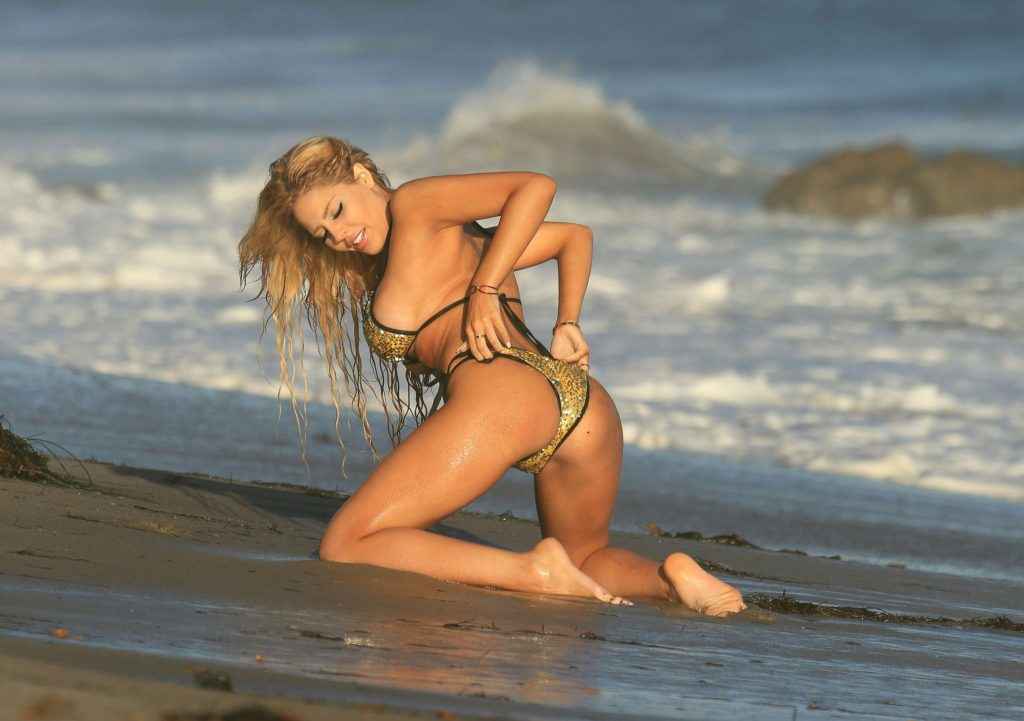 Jane Soul pose seins nus sur la plage