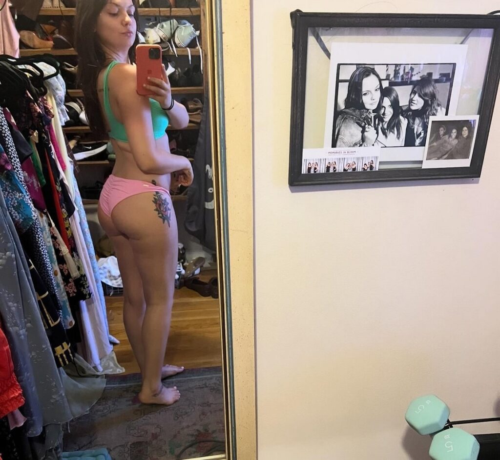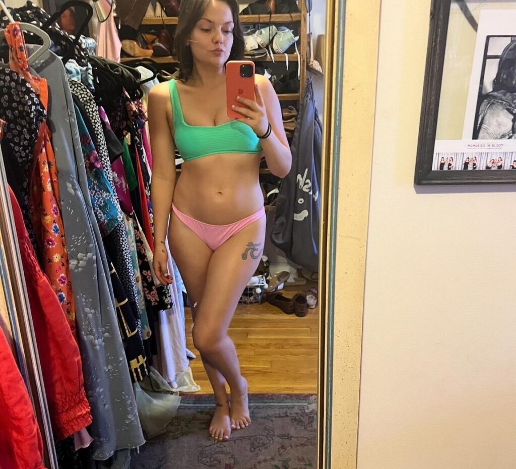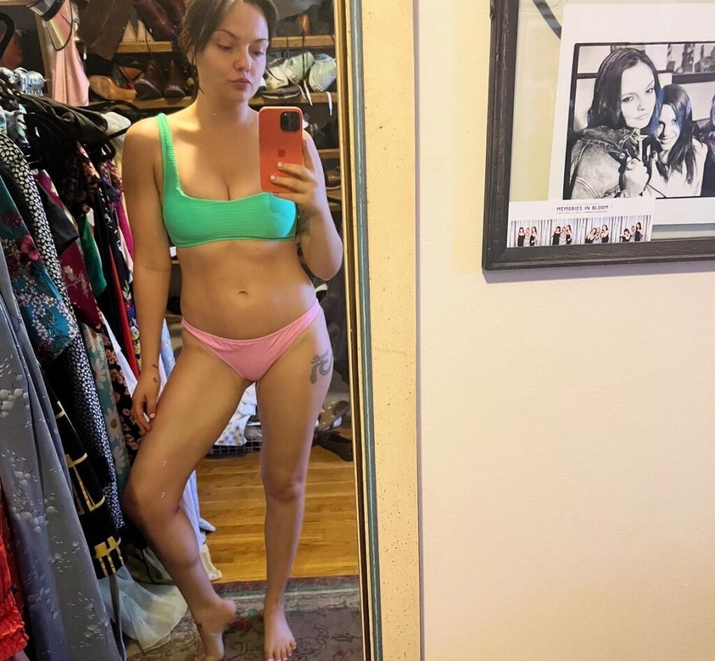 L’actrice Emily Meade nous dévoile son corps dans un bikini deux-tons rose et vert.