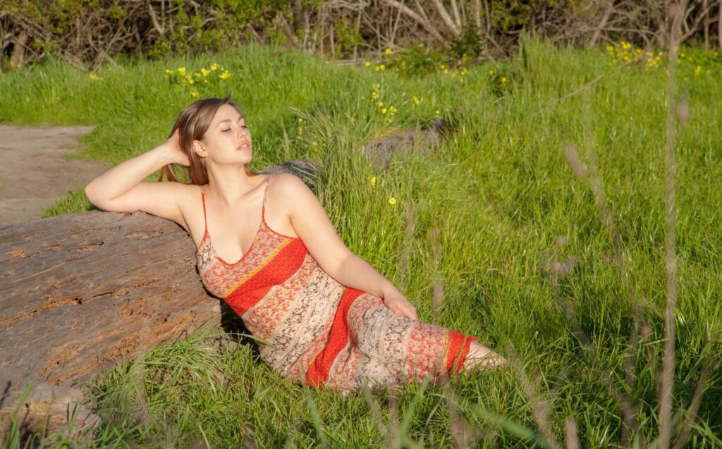 La lumière dorée caresse sa peau pendant que la robe glisse lentement le long de ses hanches. Lillias Right, pieds nus dans les herbes hautes, s’abandonne à la nature avec une sensualité désarmante. Le tissu léger tombe, dévoilant la nudité pleine et assumée de la star. Sa peau nue contraste avec le vert sauvage qui l’entoure, et chaque mouvement semble jouer avec ses courbes.