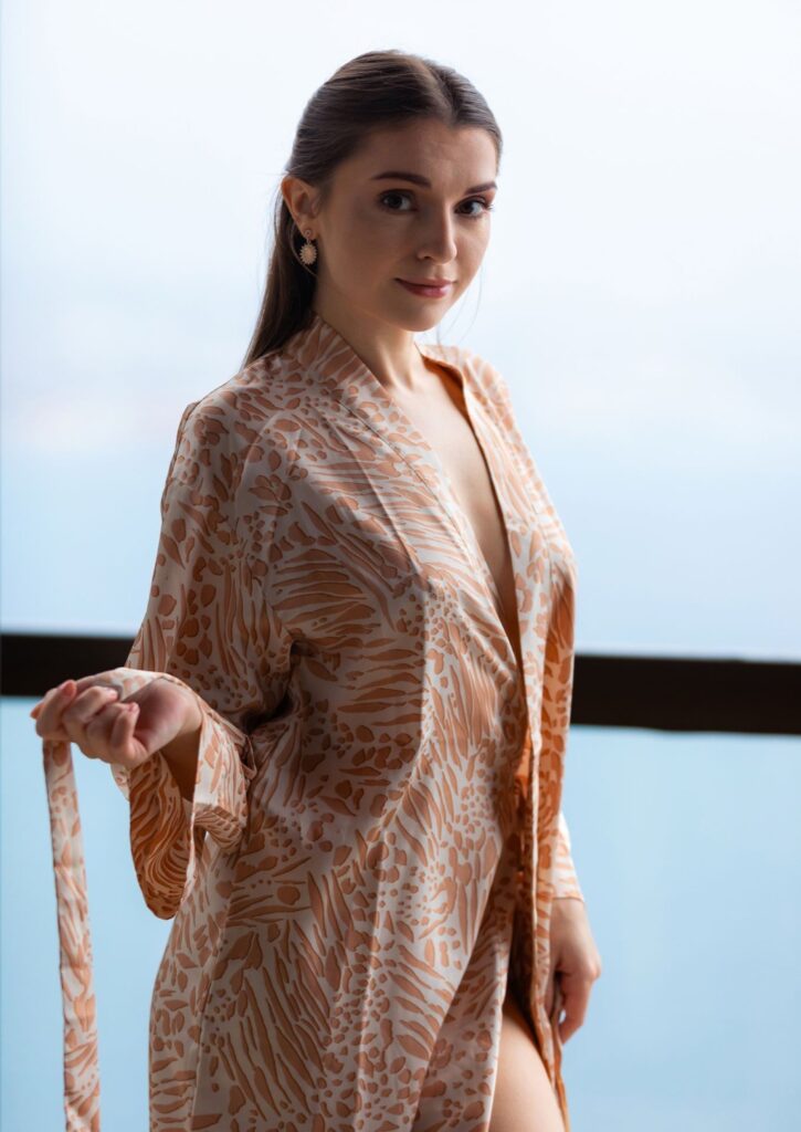 D’abord, il ne s’agit que d’un simple frémissement, un souffle sur sa nuque, une étoffe de soie qui glisse lentement sur sa peau nue. Monika joue avec les limites, les tient du bout des doigts, puis les défait avec une grâce provocante. Son kimono brun se détache, millimètre par millimètre, révélant les courbes qu’il ne faisait qu’effleurer.