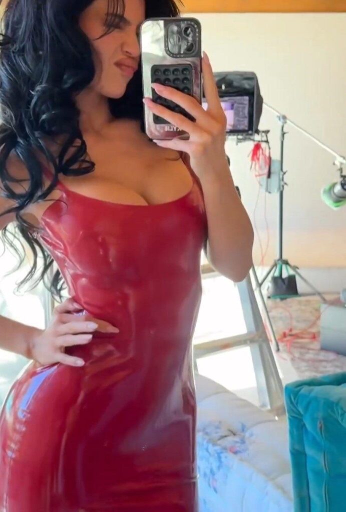 Sa tenue, à la fois audacieuse et élégante, épouse parfaitement ses courbes, mettant en valeur chaque détail de sa silhouette.