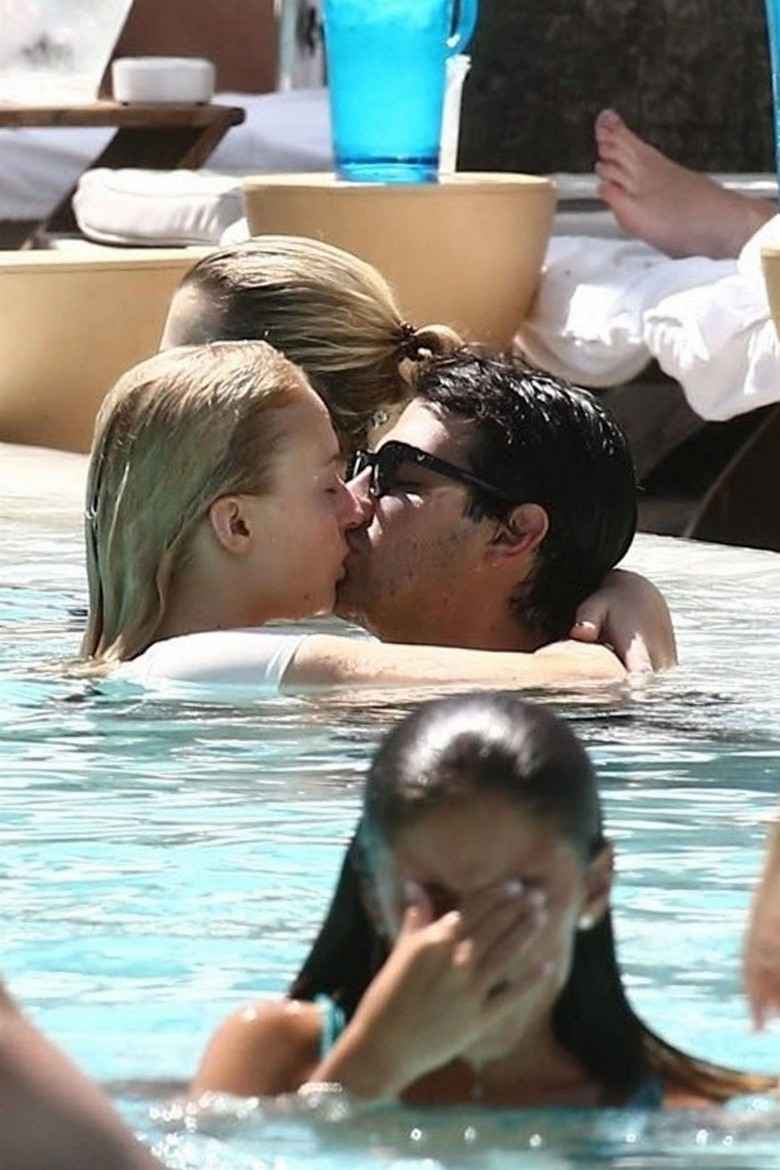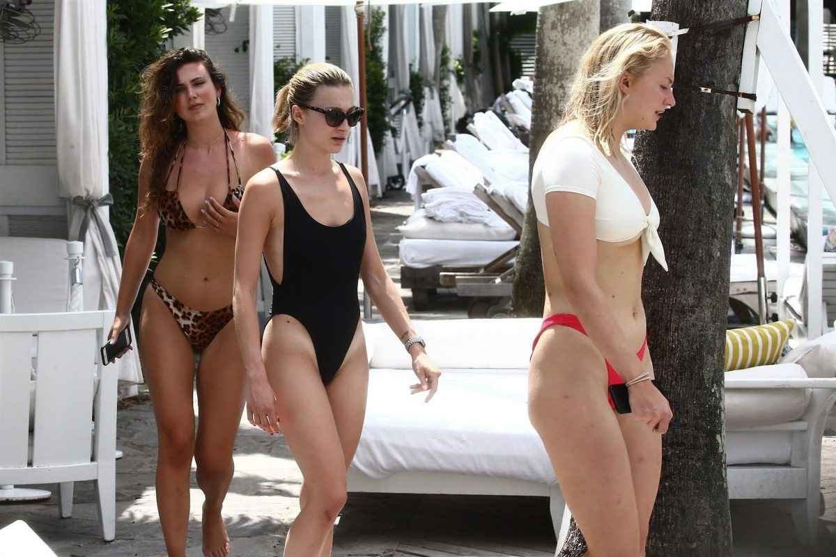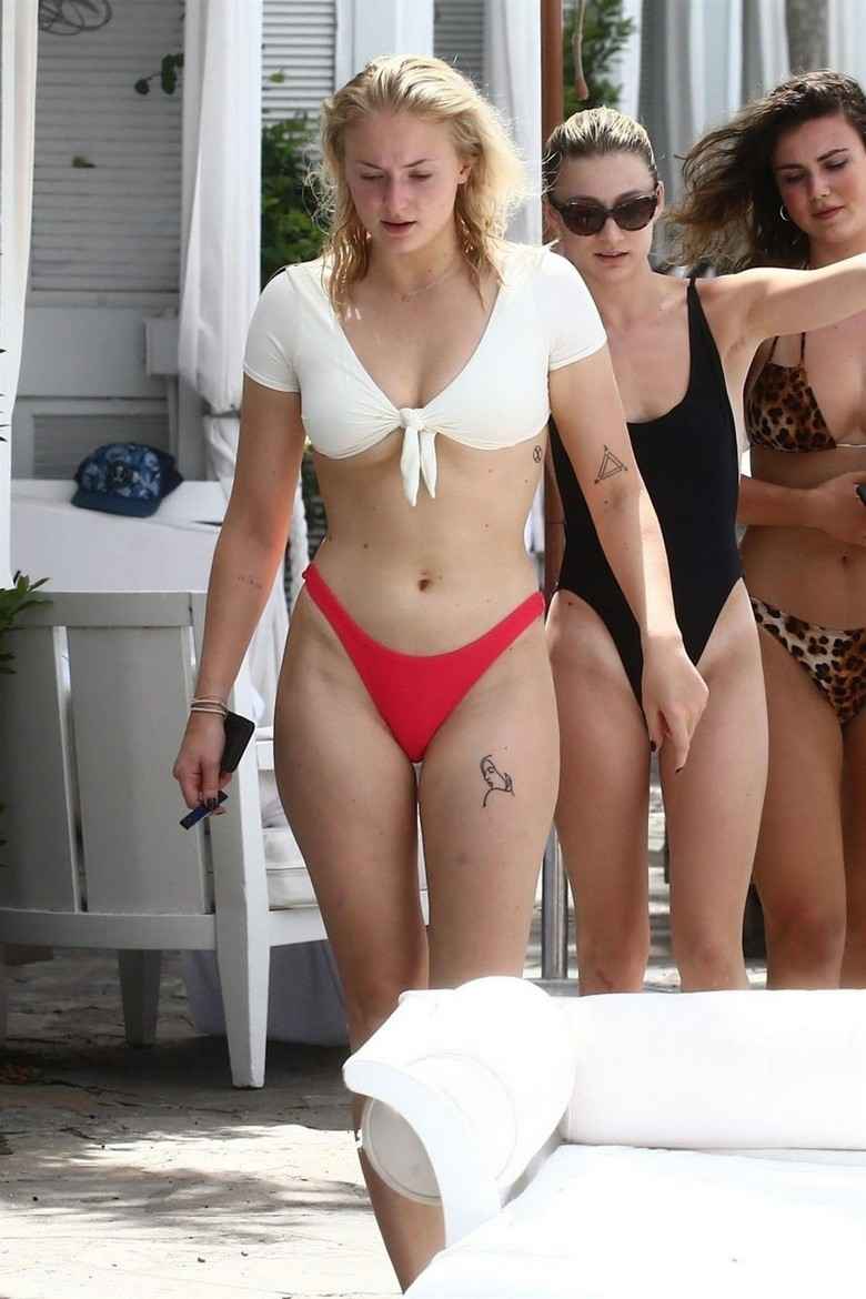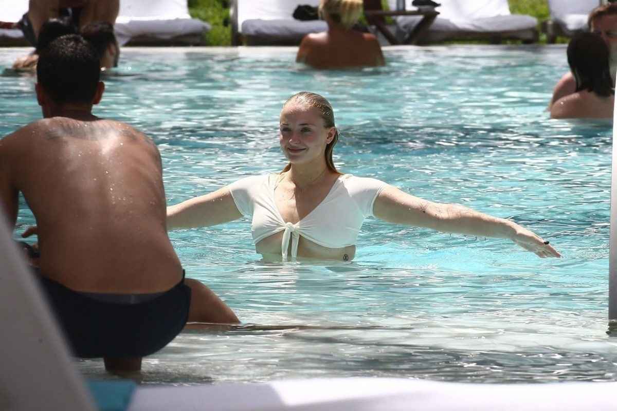 Sophie Turner en bikini blanc et rose