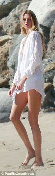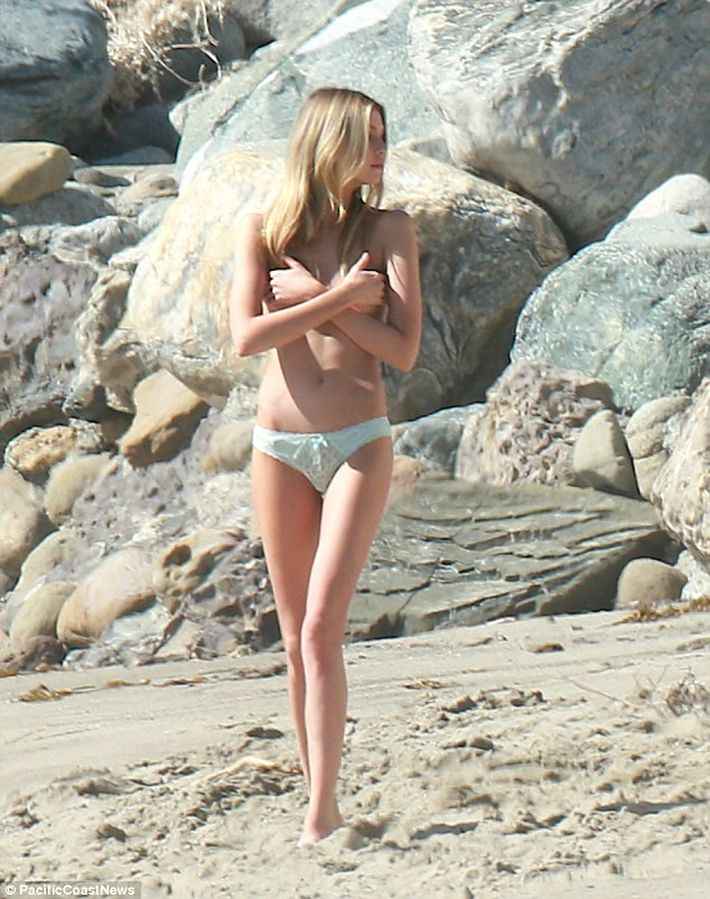 Stella Maxwell seins nus et en petite culotte à la plage